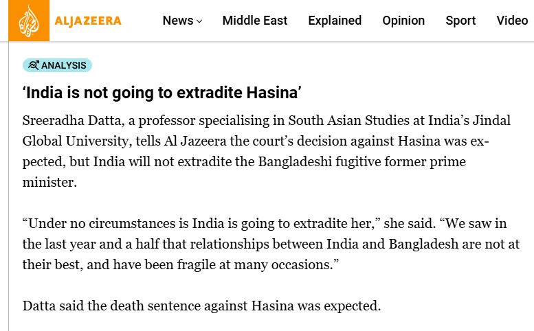 আল জাজিরায় প্রকাশিত প্রতিবেদনে অধ্যাপক শ্রীরাধা আরও বলেন, “গত দেড় বছরে দেখা গেছে, ভারত–বাংলাদেশ সম্পর্ক স্থিতিশীল থাকলেও অনেক সময় তা ভঙ্গুর হয়ে পড়েছে। এমন প্রেক্ষাপটে ভারত তার (শেখ হাসিনার) প্রত্যর্পণে আগ্রহী হবে না।”